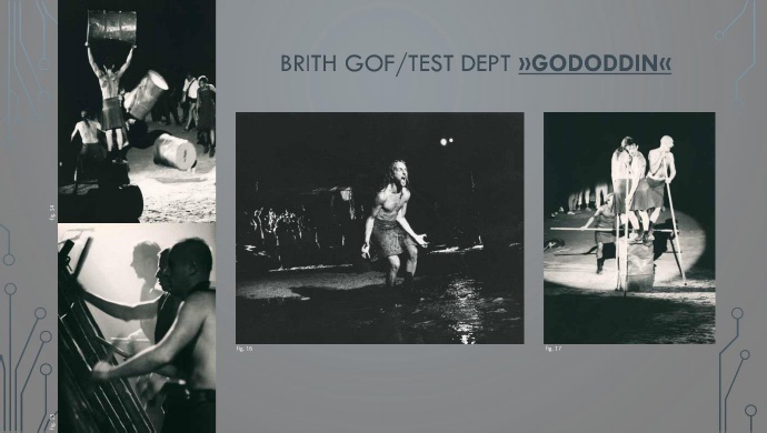 The Gododdin consisted of three complimenting performance layers. First, the physical performance: two female and four male actors depicting the Gododdin war band, and engaging with the constructed set-environment. The set for the Cardiff-shows, for instance, consisted of 600 tons of sand, 50 trees, 30 wrecked cars, and was flooded at some stage during the performance. Second, the musical performance layer, mainly provided by Test Dept. A mixture of intense industrial sound and harmonic classical passages, underlined at times by bagpipe playing. Third, the narration: Stanzas of Y Gododdin were sung and narrated, partly in Welsh, partly in English. The stratification into different layers allowed for a re-capture of the performance on record. Even without the physical performance context, music and narration alone are able to function as a self-contained work of art. (Source of information: http://www.academia.edu/9920880/Construed_in_the_light_of_current_affairs._Concepts_of_Celtic_in_Test_Dept_Brith_Gof_s_Gododdin )
