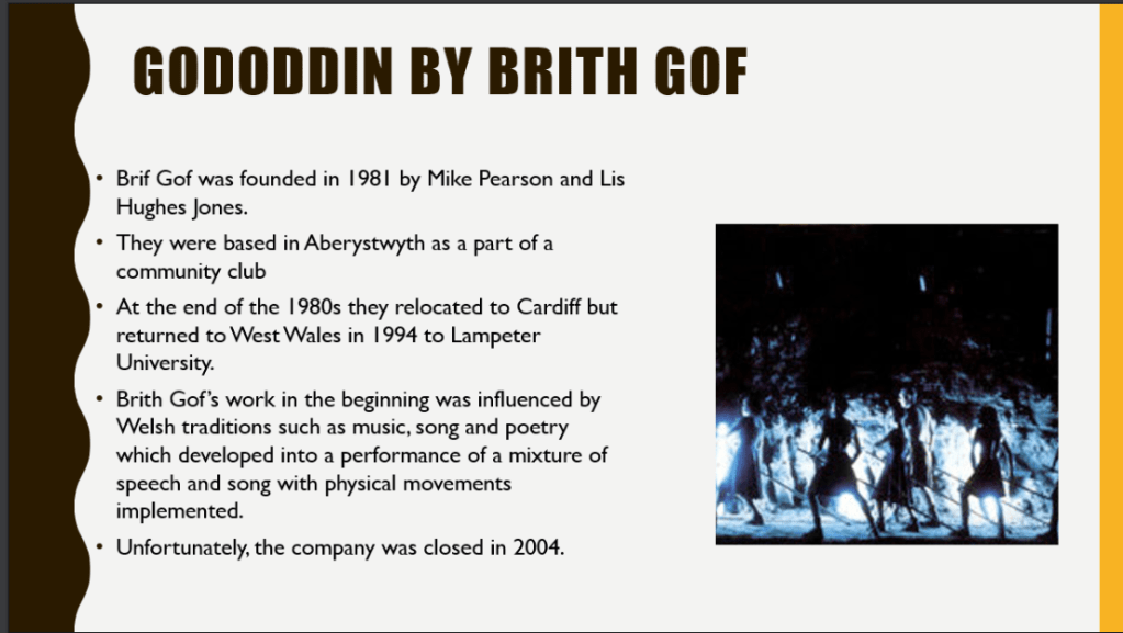 The company Brith Gof was founded in the early 1980s by Mike Pearson and is Hughes Jones, who began as residents of a community club in Aberystwyth called ‘the Barn Centre’. They continued their work together and decided to move down to Cardiff but then later on in around 1987 they moved from Cardiff back to West Wales to continue work in the University of Lampeter. They did quite a bit of traveling. Whilst at the Barn Centre they met the artist Clifford McLucas who began to design elements for their performances. He eventually became a full time member of the artistic team and he and Mike Pearson became joint artistic directors of the company. Brith Gof’s work in the beginning was influenced by Welsh traditions such as music, song and poetry which developed into a performance of a mixture of speech and song with physical movements implemented. Unfortunately, the company was closed in 2004.
