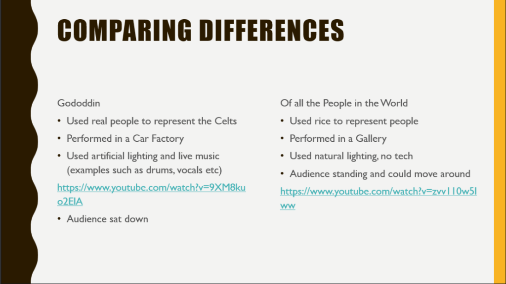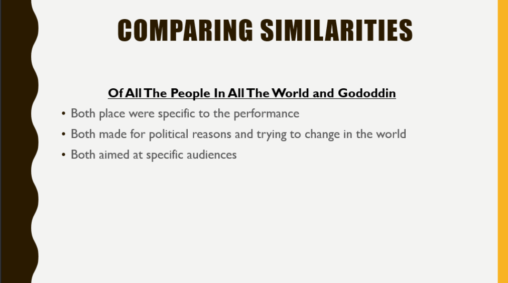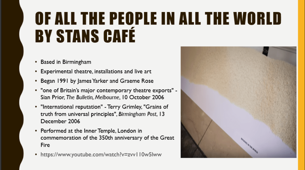 My strengths of the presentation today were the following; I used a lot of relevant information, I tried to make it a group discussion rather than just one person talking at a time when we were discussing the contrasts, we opened up a class conversation about whether ‘Of all the people in all the world’ by Stan’s Café was a sight specific performance or not, I made sure not to read off the screen as this would make the audience disconnect to what I’d be trying to put across. My weaknesses were the following; at times I’d stutter of loose track of what I was trying to say, I’d repeat things I’ve said previously, due to nervousness I would move slightly for example a few times I caught myself moving my leg without realizing. Improvements that could have been made are the following; we could have implemented the positives and negatives of each sight, but we still mentioned similar things. We could have had some help from certain member of our group as it was mostly myself, Becky and Becky that did the work. It made it a lot more stressful.
